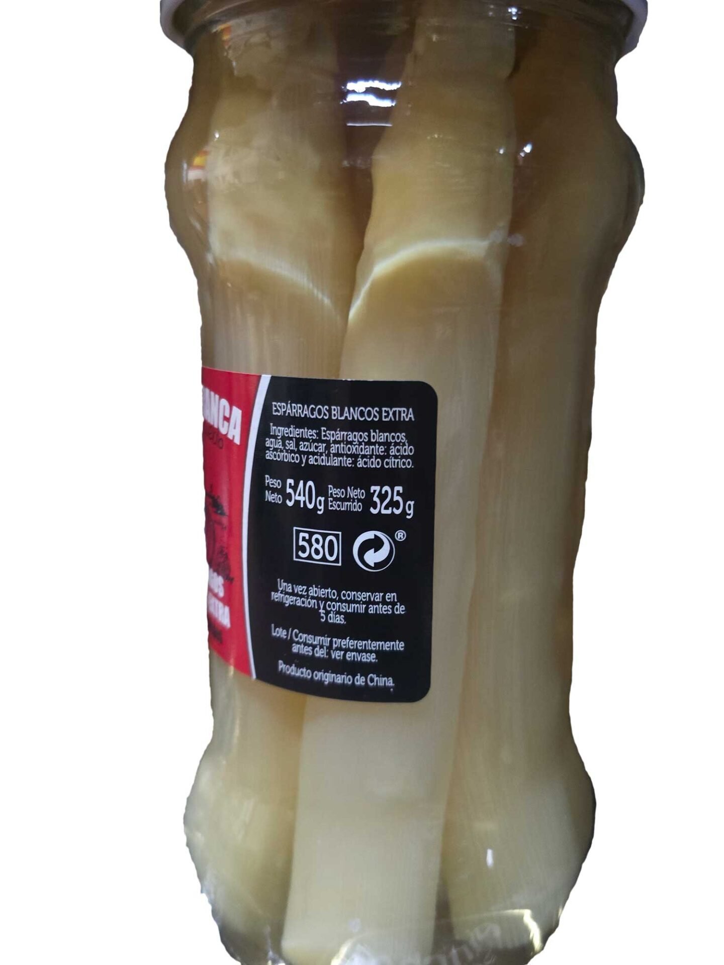 Espárragos blancos, agua, sal, azúcar, antioxidante: ácido ascórbico y acidulante: ácido cítrico.